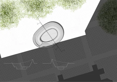 The bench sits in rather than on the square. It is round and clad in soft pine boards, inviting passers-by to take five steps down and sit back in the sun. From one's position below street level, one experiences the surroundings from a new perspective – the square, the church, the clouds and the many pedestrians, birds and summer foliage. The bench makes a setting for a quiet moment in the busy inner city, a cosy chat between friends, a lunch break under the trees or a little nap in the sun.