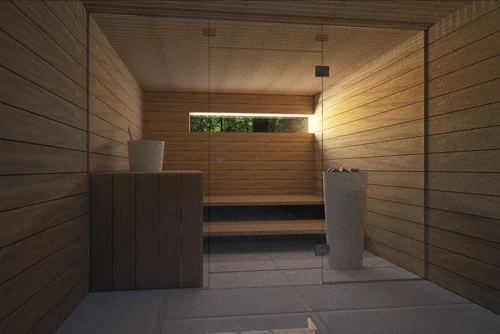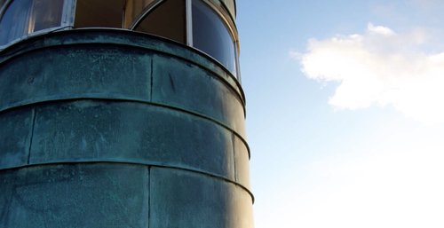 On the walk towards the other end of the rooftop, you have a view out to Fredenspark and the city beyond. The path curves above you once again, sheltering you before you step out on the small bridge that leads the way to the other house. Inside it there is a soft, suggestive light falling on the outside walls. This is a round space. You could stay right here on a bench if you wanted, but today you continue walking around the curved wall. You slide the door open and enter a warm space. This way leads you to a rounded room where there are inclined seats against the walls. Light falls down from the large round skylight. You sit and look up at the softly framed view of the sky...